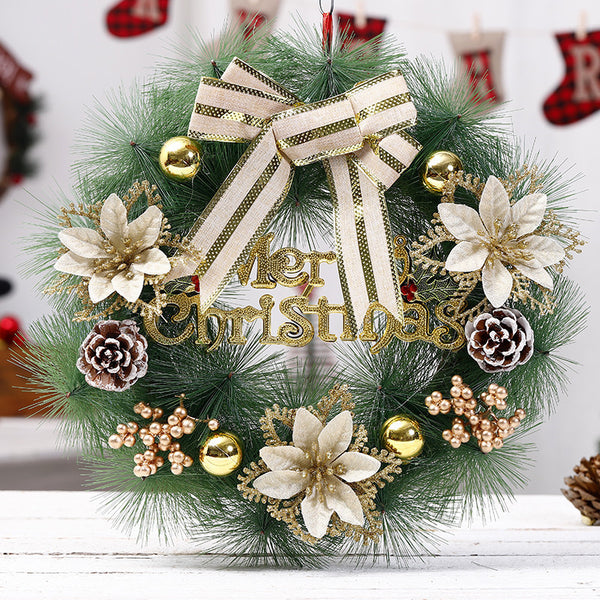 Elegant “Merry Christmas” Door Wreath – Festive Golden Bow & Pine Ornament Decoration ✨