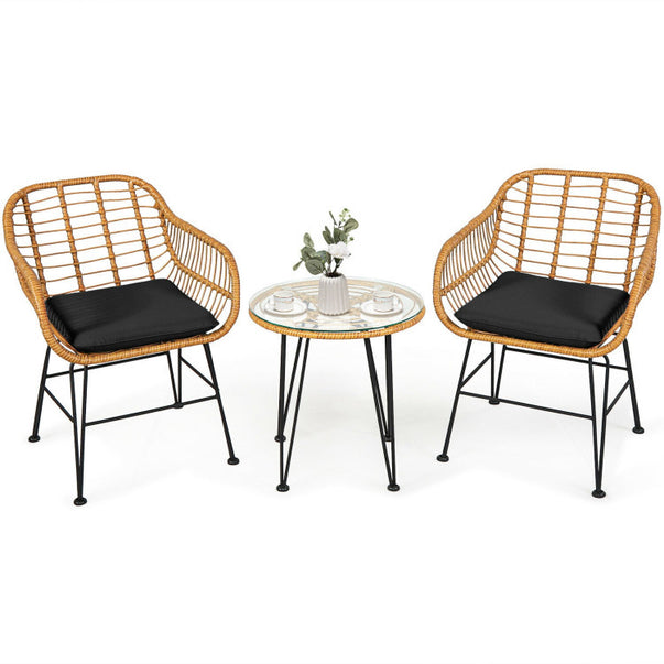 ๐ค Urban Chic Rattan Bistro Set โ 3-Piece Handwoven Outdoor Lounge with Black Cushions & Glass-Top Table โโจ
